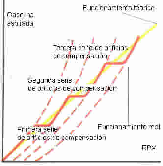 En el gr�fico se muestra el efecto del aire que limita el enriquecimiento de la mezcla a altos reg�menes, haciendo que la cantidad de gasolina aspirada se aproxime siempre a la te�rica. La curva de la gasolina aspirada realmente, presenta unos escalones que corresponden a la intervenci�n de los distintos orificios de compensaci�n. |