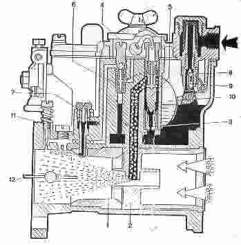 | 1. Difusor. 2. Centrador. 3. Surtidor principal. 4. Surtidor de aire principal. 5. Emulsor. 6. Surtidor de marcha lenta. 7. Surtidor de la bomba de aceleraci�n. 8. V�lvula de cierre. 9. Aguja. 10. Flotador. 11. Tornillo de regulaci�n de m�nimas. 12. V�lvula de mariposa. |