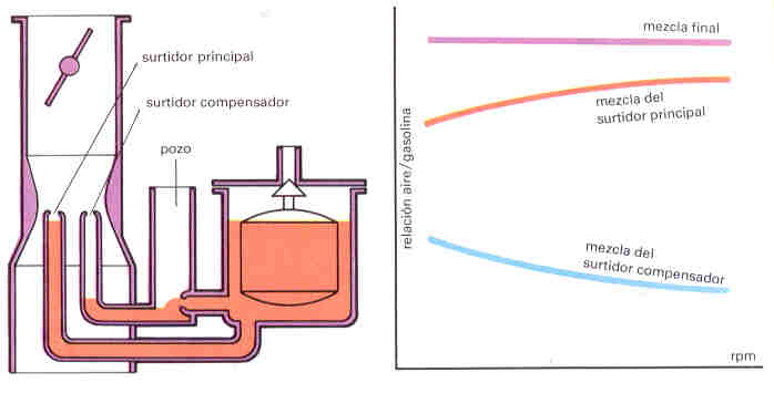 | Tambi�n llamado de surtidor compensador ya que posee una cuba compensadora que est� abierta a la atm�sfera conocida como pozo. El surtidor principal suministra una mezcla cada vez m�s rica a medida que aumenta la velocidad del motor, mientras que lla cuba auxiliar o compensadora va disminuyendo la riqueza de la mezcla, para as� poder llegar a una mezcla conjunta de cualidades constantes. El surtidor principal se calibra para reg�menes elevados mientras que el auxiliar trabaja a bajas revoluciones. |