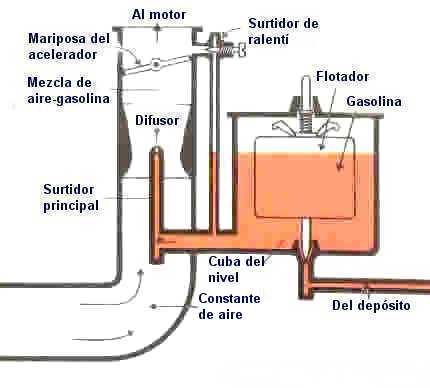 | La cuba mantiene un nivel constante en el combustible, lo cual permite al flotador abrir o cerrar el paso del mismo al carburador, por medio de una v�lvula de aguja. La posici�n del flotador puede ser graduada cuando se le hace mantenimiento. El difusor est� dotado de un estrangulador en tubo Venturi, el cual sirve para generar la depresi�n necesaria para aspirar el combustible. La velocidad en este lugar del carburador debe estar entre los 100 m/s y los 300 m/s. El surtidor principal o pulverizador debe desembocar a un nivel superior al que esta el combustible y sirve para llevarlo a la zona de depresi�n del difusor. El caudal del surtidor depende del valor de la depresi�n y de su propio di�metro. El di�metro del orificio, conocido como di�metro del surtidor es una de las principales caracter�sticas del carburador y se expresa en cent�simas de mil�metro. Al variar este valor se enriquece o empobrece la mezcla, con lo que se puede variar las prestaciones y consumo del motor. La v�lvula de mariposa ubicada en la parte final y no estrangulada del difusor, permite al motor adaptarse a la carga haciendo variar el peso de la mezcla introducida. |