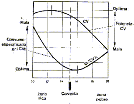 | En la figura se encuentra la comparaci�n de la curva de potencia en CV con respecto a la curva de consumo en gr/CVh, dependiendo de la dosificaci�n que se regule en la carburaci�n. Como se puede notar la mayor potencia se obtiene con un a entre 12 y 13 y exactamente con un valor de 12,5 pero se nota que el consumo para este punto es elevado, por otro lado el mejor consumo se encuentra para un a de 16 pero con una notoria disminuci�n en la potencia. Estas proporciones est�n influenciadas por diferentes variables como son la presi�n atmosf�rica, la temperatura del ambiente y la calidad de proceso de fabricaci�n de la gasolina. Adem�s de esto seg�n la situaciones o aplicaciones del motor se presentan necesidades de mezclas ricas o pobres, teniendo en cuenta que una mezcla rica es cuando se tiene m�s gasolina que aire y una pobre el contrario, teniendo como base la relaci�n estequiom�trica. Las mezclas ricas se utilizan en los siguientes casos: a) al arrancar el motor, b) al acelerar y c) al pedirle al motor m�xima potencia. Las mezclas pobres se utilizan a) cuando la velocidad del motor es lenta y estable, b) cuando se quiere disminuir el consumo y c) en momentos de desaceleraci�n. |