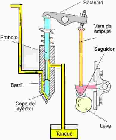 | Inyectores El inyector PT es una unidad mec�nica sencilla que recibe combustible lo dosifica, inyecta y atomiza a distintas presiones desde el conjunto de bombas de inyecci�n. Todos los inyectores tienen un embolo que se mueve alternativamente en el cuerpo del inyector, accionado por el �rbol de levas a trav�s del balanc�n. Ciclo de funcionamiento del inyector: Dosificaci�n: Cuando el pist�n sube se destapa el orificio de dosificaci�n y el combustible llena el inyector. Inyecci�n: El �mbolo baja por acci�n del balanc�n, tapa el orificio de admisi�n y empuja el combustible por los orificios de pulverizaci�n Retorno del combustible Terminada la inyecci�n el �mbolo se asienta en el espacio colector del inyector y el combustible pasa por los conductos de retorno. |