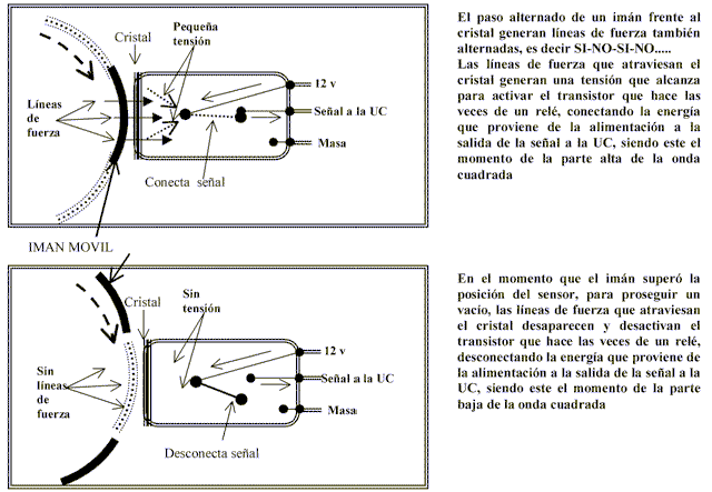 | Las l�neas de fuerza atraviesan el cristal, pero estas se ver�n interrumpidas al girar la campana met�lica e interponer las aletas entre el im�n y el sensor, generando as� "golpes de tensi�n" que ser�n tomadas por la UC como una se�al digital, que en el osciloscopio se ver�n como una onda cuadrada | ||||||||||||||||||||||||||||||||||||||