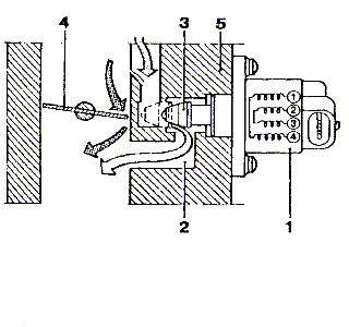 | El actuador montado en el cuerpo de mariposa es el que corregir� el caudal de aire para el funcionamiento en ralent� del motor. 1 motor paso a paso (actuador) - 2 pasaje del aire paralelo al tubo de admisi�n - 3 cono desplazable - 4 mariposa de aceleraci�n - 5 cuerpo de mariposa | ||||||||||||||||||||||||||||||||||||||
