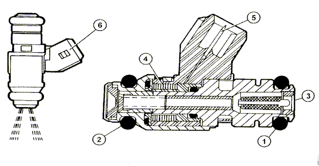 Este es el actuador para el cual trabajan todos los sensores y actuadores de la inyecci�n electr�nica: 1 y 2 anillos de goma que aseguran la estanqueidad en el conducto de admisi�n y en la rampa de alimentaci�n - 3 entrada de combustible - 4 bobina conectada a los terminales 5 (pines) - 6 conector |