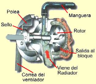 | 5. Bomba del agua La bomba de agua es una bomba centr�fuga accionada por el motor mediante una correa. La capacidad de la bomba de agua debe ser suficiente para proporcionar la circulaci�n del refrigerante. Esta bomba se utiliza para hacer circular el l�quido refrigerante por todas las partes del circuito de refrigeraci�n del motor; el flujo del l�quido refrigerante regresa a la bomba de agua a trav�s del desviador cuando est� cerrado el termostato y por el radiador cuando el termostato est� abierto. |