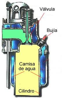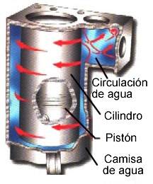 | PARTES DEL SISTEMA DE ENFRIAMIENTO POR AGUA El sistema de enfriamiento por medio del agua se compone de las siguientes partes: Camisas de cilindros. Radiador. Mangueras de conexi�n. Ventilador. Bomba de agua. Tap�n. Termostato. L�quido refrigerante. 1. Camisa de los cilindros Las camisas de los cilindros transfieren el calor desde el interior de los cilindros hasta el exterior. Estas camisas pueden ser h�medas es decir que permiten que el liquido refrigerante circule alrededor de los cilindros para lograr un mejor enfriamiento. En las gr�ficas de la derecha se puede apreciar la camisa de agua el pist�n, el cilindro y como el agua circula dentro de estos conductos para llevar a cabo la refrigeraci�n. Las camisas de agua o llamadas tambi�n h�medas no solo rodean el cilindro sino tambi�n la c�mara de combusti�n, los asientos de las buj�as, los asientos y gu�as de las v�lvulas y las partes en contacto con los gases producto de la combusti�n. |