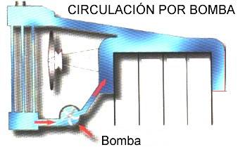 | Circulaci�n por bomba La bomba se coloca entre el radiador y el motor en un punto bajo del circuito. La velocidad de evacuaci�n se limita seg�n la capacidad de la bomba y la refrigeraci�n tambi�n depende de esta. |