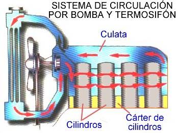 | Circulaci�n por termosif�n y bomba Este sistema combina los anteriores, funciona por termosif�n pero con ayuda de la bomba mejora la circulaci�n del l�quido refrigerante. La bomba puede estar fija sobre la culata o sobre el c�rter de cilindros, est� generalmente situada a la salida del l�quido fr�o y dirigido hacia el c�rter de cilindros. El l�quido sube a continuaci�n hacia la culata y retorna al radiador. En el caso de fallo en la bomba la circulaci�n del l�quido se convierte en 100% de termosif�n. |