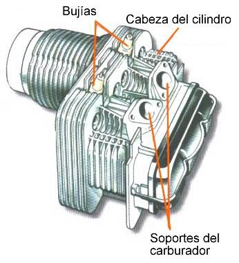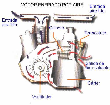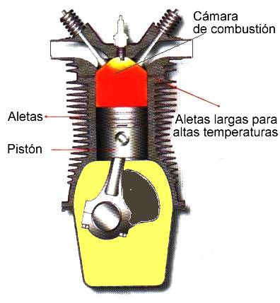 | Por lo general este tipo de motores son mas ruidosos pues las ondas sonoras provocadas por la combusti�n salen r�pidamente sin ser amortiguadas por otros componentes debido a la sencillez de los motores. El principio de funcionamiento de este sistema es transportar el calor por el principio de conducci�n mediante la carcaza, para ello se utilizan las aletas las cuales son prolongaciones del metal de aleaci�n que cubren la culata. Estas aletas aumentan el �rea de la culata proporcionando mayor superficie que queda en contacto con el aire y enfriando el interior. |