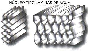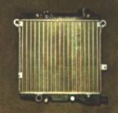 | Radiador con n�cleo tipo l�minas de agua Hechos por unos tubos anchos y muy chatos montados haciendo unas ondulaciones soldadas entre s� o bien se separan y sostienen con unas finas chapas de lat�n, las cuales dan rigidez a los pasos hexagonales del aire formando un falso panal. En los dos casos el aire que pasa por entre los tubos chatos, enfr�a las l�minas de agua que circula en el interior de ellos. |