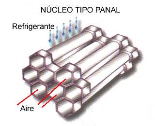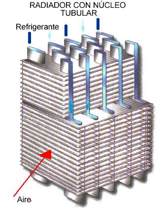 | N�cleo del radiador El n�cleo del radiador pueden construirse de tres tipos: tubular, de panal y l�minas de agua. Radiador con n�cleo tipo tubular Tiene unos tubos por los que el l�quido refrigerante pasa, este liquido viene de las camisas de los cilindros y de la culata. El aire circula alrededor de los tubos y las aletas. Las aletas pueden ser perpendiculares a los tubos, o intercalas en acorde�n entre tos tubos. |