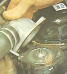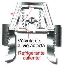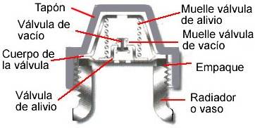 | 3. Tap�n o tapa del radiador El tap�n del circuito mantiene una presi�n en el radiador con el fin de que la temperatura de ebullici�n sea mayor. La entrada de aire o l�quido al radiador con el motor fr�o se produce autom�ticamente. La tapa del radiador o la tapa del vaso de expansi�n en algunas ocasiones traen dos v�lvulas, la primera es una v�lvula de alivio que limita la presi�n en el sistema de enfriamiento a un nivel predeterminado. La segunda es una v�lvula de ventilaci�n de vac�o (presi�n). |