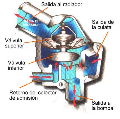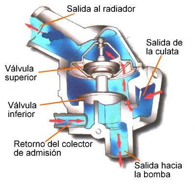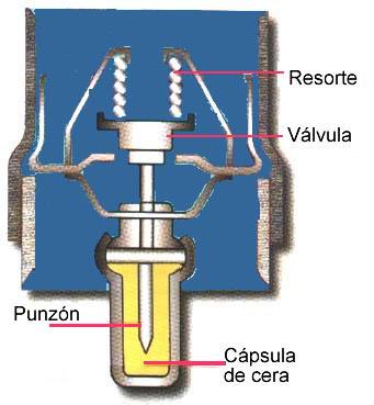 | En la figura se puede ver que cuando el motor est� caliente la cera se dilata y la v�lvula superior se abre, el agua que viene de la culata pasa por el radiador, mientras que la v�lvula inferior cierra la circulaci�n. | ||||||||||||||||||||||||||||||||||||||||||||||||||||||||||||||||||||||||||||||||||||||||||||||||||||||||||||||||