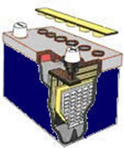 | Es un grupo de dos o m�s elementos acumuladores de energ�a el�ctrica, conectados entre s� en serie para aumentar la tensi�n suministrada por cada uno de ellos, o en paralelo para aumentar la intensidad total de la corriente. La bater�a es la fuente que entrega la corriente primaria para el funcionamiento constante del sistema de encendido. Para aumentar su vida �til, es decir, que su tiempo de descarga aumente casi indefinidamente esta se mantiene en carga constante por medio del alternador, el cual es un generador de corriente alterna que recibe su movimiento directamente del motor. |
