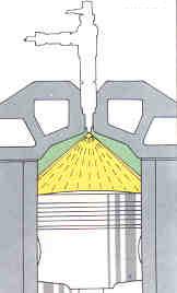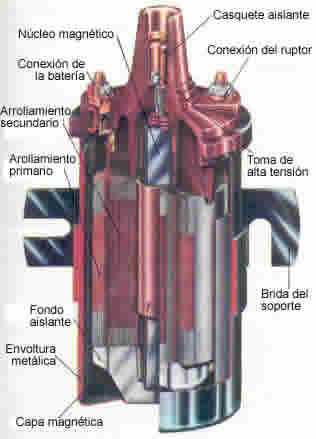 | Es el elemento el�ctrico que se encarga de generar un impulso de tensi�n lo suficientemente alto para hacer saltar la chispa entre los electrodos de la buj�a.Para este fin est� constituida por dos arrollamientos ubicados uno directamente sobre el otro. El primario que recibe la corriente de la bater�a y al cual cuando se le interrumpe el paso hace que el secundario sea inducido y debido a la diferencia en cantidad de espiras genere una corriente que es capaz de vencer el poder aislante que presenta la mezcla del combustible. En la figura anexa se encuentran las partes principales de una bobina. Adem�s de generar alta tensi�n para el encendido de la mezcla la bobina cumple otras funciones que son enviar esa alta tensi�n sin retraso con respecto al momento preestablecido por la apertura del ruptor o por la se�al del captador, crear un chispa con energ�a suficiente para iniciar el encendido, funcionar de forma regular al variar la velocidad del motor y poseer la capacidad de resistir el corto circuito cuando se deja al contacto de arranque cerrado, es decir, se deja en acci�n el arranque del motor. |