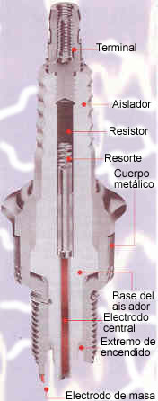 | Las partes principales de una buj�a son el aislador, los electrodos y la base del aislador o sellador. Adem�s de estas se encuentran otras como son la terminal que es en donde se conecta el cable procedente del distribuidor, un resistor o resistencia que se utiliza para evitar interferencias en sistemas el�ctricos o electr�nicos que se encuentren cerca del motor y un resorte que mantiene en posici�n al resistor. | ||||||||||||||||||||||||||||||||||||||||||||||||||||||||||||||||||||||||||||||||||||||||||||||||||||||||||