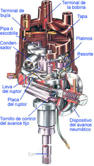 | Este elemento se utiliza en los motores de m�s de un cilindro, se utiliza para repartir a las buj�as la corriente de alta tensi�n necesaria para iniciar la combusti�n de la mezcla. El conjunto completo que se muestra en la figura, es llamado t�cnicamente "delco" el cual es el conjunto completo de distribuidor, el condensador y ruptor para el encendido por platinos y el dispositivo de avance neum�tico. De las partes que se pueden ver en la figura, existen dos principales por su funcionamiento que son: Una fija, que es la tapa en la cual se introduce el terminal del cable procedente de la bobina y los que se dirigen hacia las buj�as. Otra parte m�vil, la cual es realmente el distribuidor constituido por una pipa giratoria o escobilla, que toma la corriente de un contacto central y la distribuye a las terminales de las buj�as. La velocidad de rotaci�n es exactamente la misma que la del cig�e�al en el caso de los motores de dos tiempos y la mitad para los de cuatro. |