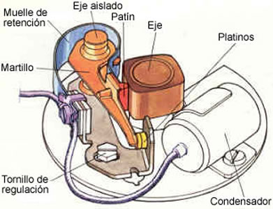 | Es �nicamente utilizado en motores con encendido por platinos. Est� situado dentro del distribuidor y se encarga de interrumpir peri�dicamente la corriente en el arrollamiento primario de la bobina. Esta interrupci�n se logra por la apertura de los platinos, la cual es comandada por la leva, que gira inducida por el eje del distribuidor que est� sincronizado con el motor. |