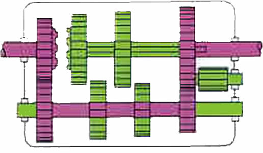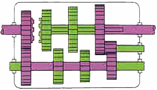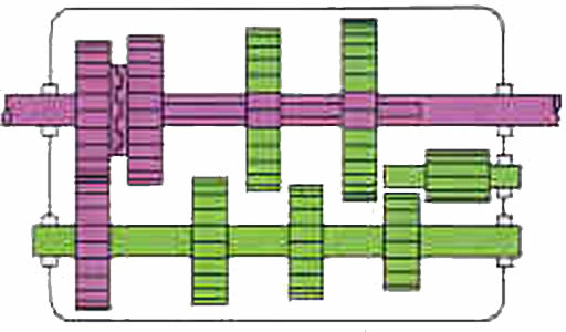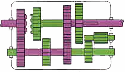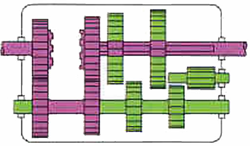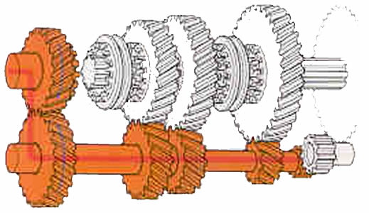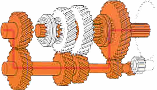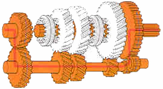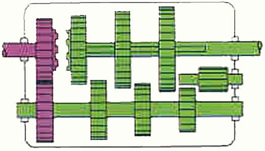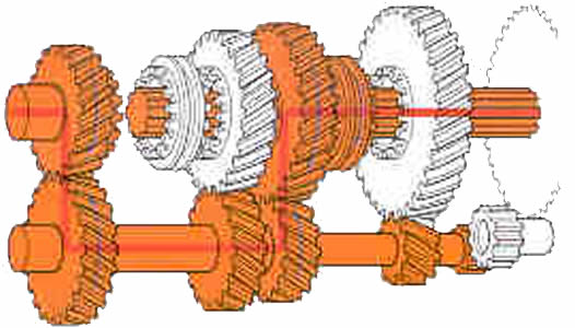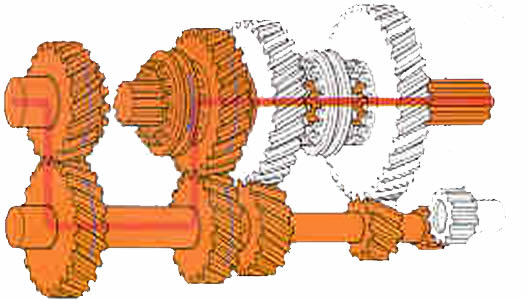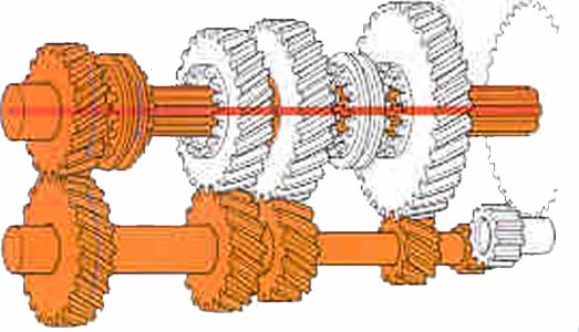 | Marcha atr�s: Entre el eje auxiliar y el de salida se interpone un peque�o eje con un pi��n inversor y hace que el sentido de rotaci�n del eje de salida sea realizada en direcci�n contraria. |