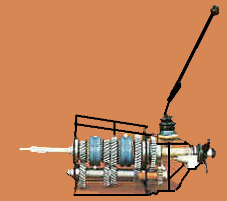| TRANSMISI�N MEC�NICA El principio de funcionamiento de una transmisi�n mec�nica se basa en el desplazamiento de engranajes. Por medio de una varilla de mando, unida a un varillaje o a un sistema de guayas, se empujan o halan pi�ones que seg�n su n�mero de dientes y di�metro proporcionan una velocidad de salida del motor. El conjunto consta de tres ejes. El primero que esta conectado directamente al motor y se conoce como eje toma y da la entrada de movimiento a la caja, a este se encuentra unido, por medio de un engranaje, el eje secundario o eje libre el cual se encarga de transmitir el movimiento a un tercero que es el que transmite el movimiento con la velocidad necesaria de salida. Para explicar el funcionamiento completo se ha seleccionado una caja de cuatro cambios adelante con una relaci�n para marcha atr�s y un punto muerto o neutral. |
