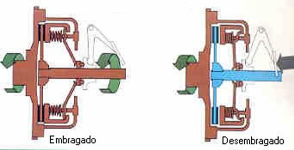 | EL EMBRAGUE Para realizar cada uno de los cambios debe soltarse temporalmente la uni�n que permite el movimiento del eje toma, esto se realiza por medio de un sistema de embrague. Al activar el mecanismo del embrague, en el caso de la figura es por medio de pedal, se libera la uni�n que permite el movimiento del eje toma, es decir, cuando el sistema se encuentra embragado existe ransmisi�n de movimiento cuando se desembraga esta transmisi�n se detiene. Al liberar el movimiento del eje toma la inercia existente dentro de la caja hace que los ejes sigan en movimiento, pero no es lo suficientemente alta como para evitar que las marchas se acoplen suavemente. Para suavizar aun m�s el engranaje de los cambios se recurre a la utilizaci�n de sincronizadores los cuales son unos conos de embrague que est�n ubicados antes de los pi�ones libres y de los desplazables. |