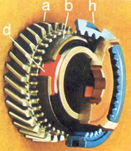 | EL SINCRONIZADOR La labor del sincronizador consiste en llevar la velocidad relativa de los dos pi�ones a engranar a cero, es decir, que en el momento en que se realiza el engranaje, la velocidad de los dos pi�ones sea la misma. Esta labor se realiza por medio de rozamiento, uniendo el collar d (rojo) y el anillo b los cuales est�n unidos respectivamente al manguito de acoplamiento h y al pi��n del engranaje a. |