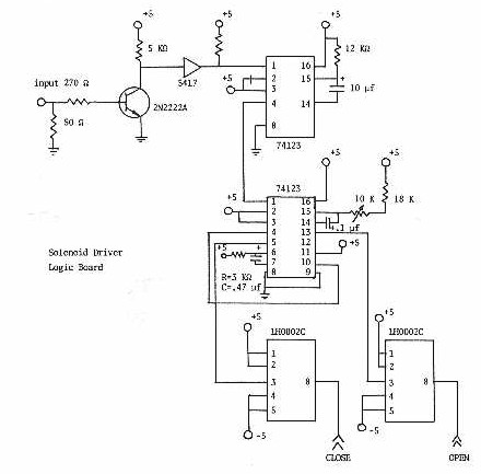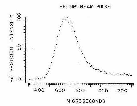 The nozzle control unit (see Figure 5) has been designed to allow for variable current pulses to be applied to both the front and back coils. The pulses are adjustable in length with the close coil being turned on as soon as the open coil is turned off. In normal operation the back coil is pulsed which causes the actuator to be pulled back off the sealing o-ring. The travel of the actuator (between 0.25-1 mm) is determined by an adjustable spacer or the tension of a small spring extending through the back coil as seen in the figure. A second pulse is then generated causing the close coil to turn on, pulling and holding the actuator back down onto the o-ring. The nozzle parameters (voltage, pulse length, spring tension, etc.) are adjusted such that a helium pulse of betwen 200-400 us (FWHM) duratlon (see Flgure 6) is produced, wlth a flow rate of approximately 1.5 torr liter at a backing pressure of 8 atmospheres.