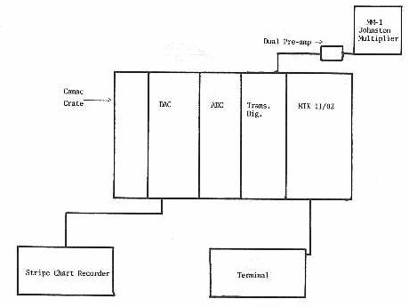 Once the ions have been created by way of photoionization, they are accelerated to constant kinetic energy and separated in time within the drift tube of the time of flight mass spectrometer. These ion packets then strike a Johnson multiplier (Model #MM-l) with a gain of up to 109 at 5000 volts. The analog signal is multiplied by an additional factor of l00 by two comlinear CLC-ll video amplifiers placed in series. From here the signal is digitized by a Camac-based fast Lecroy transient digitizer (Model # 2256AS), capable of sampling the analog waveform at a maximum rate of 50 nanosecond intervals. The digitizer then preforms an 8-bit analog to ditigal conversation storing the results in a 1024 word (16-bit) random accessible memory (RAM). The RAM is readout through the dataway into a lab minicomputer (MIK RT-ll/2) located within the Camac crate. At this point, the mass spectrum is processed so that it may be readout onto a terminal or written onto a floppy disk. From considering the digitizer's memory size it can be calculated that the maximum mass range in a single shot is 850 amu.