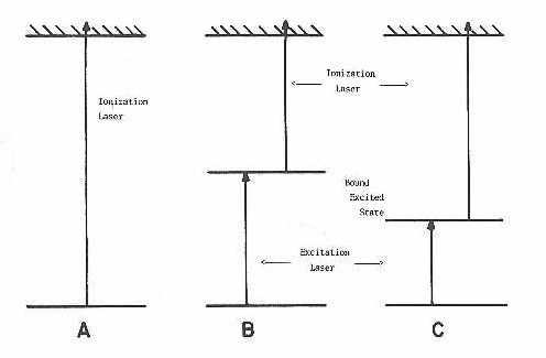 The second scheme, a resonant two-photon ionization, is used in this lab mainly for the probing of bound excited electronic states of the species under study. This type of ionization can be accomplished through either a two-photon, one or two color scheme. In the two color process, two photons of different energies are involved. The first photon (excitation) is generated from a scanning Nd:YAG pumped dye laser. The second photon (ionization), chosen to be incapable of ionization, is supplied from a fixed frequency laser (either an excimer or Nd:YAG). The overall process is a resonant absorption of the excitation photon to a bound level of an excited state from where the ionization photon promotes the electron into the ionization continuium. In the two-photon, one color scheme, both photons are of the same energy and are supplied by the same laser. In this later case, it is understood that only bound states of equal to or greater than one-half the ionization energy, will result in ion production.
