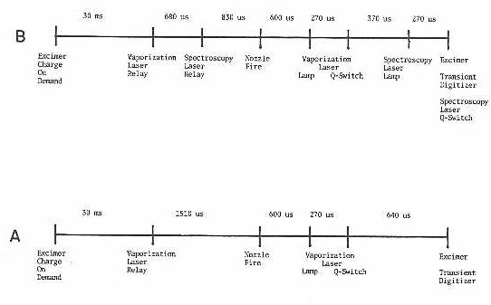 For the production and probing of these clusters, a sequential timing scheme is needed in order to control the precise firing of the independent components of the experiment. The timing sequence is initiated by a master oscillator which drives a series of Nimbin-based delay generators at a repetition rate of 10 Hz. Two schemes have been used for the experiments in this thesis and are shown in Figure 10 (labeled A and B). Timing scheme A is used to acquire simple mass spectrum; while scheme B is used for spectroscopic investigations via resonant two-photon ionization.