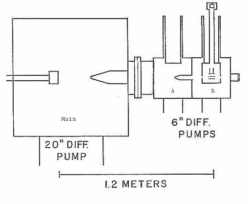 The main chamber was a large stainless steel cylindrical can with a volume of approximately 600 liters and was pumped by a HS20 Varian diffusion pump (20 inch diameter, type 165) capable of pumping 21,000 liter/s of helium in the range of l.3 x lO-3 to l x lO-9 torr. Under normal operating conditions, a base pressure of l x lO-4 and l x lO-6 torr was maintained with the molecular beam on and off, respectively.
