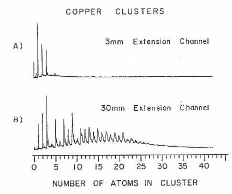 The cluster distribution which is achieved is governed by a number of parameters. The most important (with the exception of the third body: helium) is the length of the .2 cm channel from the point of vaporization to free expansion. This distance is critical in determining the maximum size cluster which is to be formed. The figure below illustrates a comparison between a .3 cm and 3.0 cm extension. These results are explained simply as permitting additional time for recombination to occur.