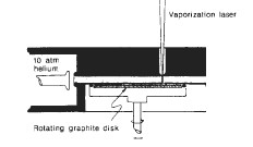 The vaporizng laser was to be directed dowm the beam axis and focused in such a manner as to vaporize material from the diagonal portion of the face plate orifice. The idea was not pursued because a literature review revealed that repeated vaporization from a single spot led to the drilling of deep holes from which subsequent vaporization becomes more difficult. With the vaporization laser running at 10 Hz the spot would be hit 600 times per minute, this leads to a pulse to pulse stability that is extremely poor and a rapid decrease in the amount of material injected into the helium carrier gas (i.e.within a few minutes).