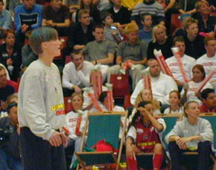 Blusen-op posituren, lært fra fodboldbanerne. Symbolikken har jeg aldrig helt fattet (se jeg kan score med en sæk over hovedet - eller kors, hvor er publikum dog grimme!??). Piger anbefales dog først at tjekke, om de har husket undertrøjen, hvis de vil kopiere denne her gestus - ellers får de måske et større bifald, end de havde regnet med! Dream Team var lidt længe om at komme igang med de sjove tricks. Er det bare mig, der husker de andre års Dream Team kampe som meget mere glade og kreative? Det skulle jo nødigt blive rutine.