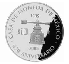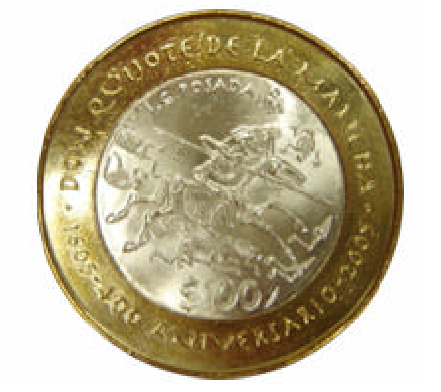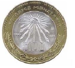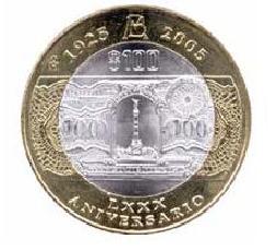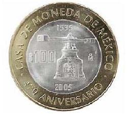 | Coin commemorating 400 years of Don Quijote (2 versions) Design: "Calavera Quijotesca" - Circulating $100 bimetallic coin - $20 2 oz. of silver coin $100 bimetallic coin commemorating 80th ann. of the Bank of Mexico (2 versions) Design: reproduction of the 1925 $100 banknote cutted into its lateral parts with the figure of the Independence Angel. - Circulating $100 bimetallic coin - $20 2 oz. .999 silver coin $100 bimetallic coin commemorating 470th ann. of Mexico's Mint (2 versions) Design: old Screw Press - Circulating $100 bimetallic coin - $10 1 oz. .999 silver coin $100 bimetallic coin commemorating the "Centenary of the 1905 Monetary Reform" Design: cap with the word liberty (as the old "cap and rays" coins). - Circulating $100 bimetallic coin - $5 1/2 oz. .999 silver coin |