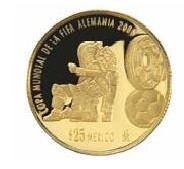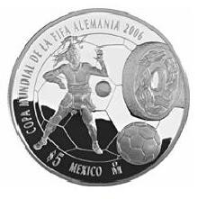 | Mexico's participation in Germany 2006 Soccer World Cup (2 versions) Design: Mayan Ball Game player of Chich�n Itz� - $5 1 oz. of .999 silver Design: Mayan Ball Game player of Tonin� - $25 1/4 oz. of .999 gold |