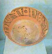 Tripode plate with some hieroglyphics and ornamentation motives . The basic color is orange, it characterizes from the Mayan classic period, on the walls there are signs, characters |