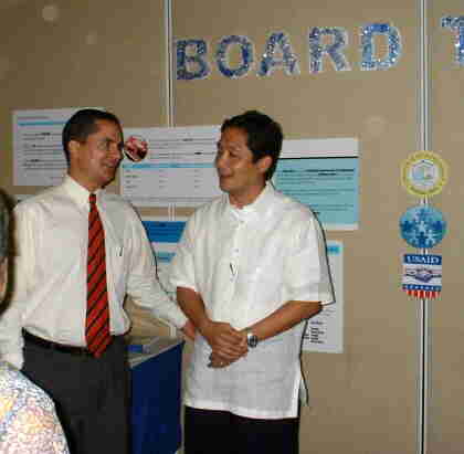 | Governor Agbayani conferring with a consultant from TFGI on the accomplishments of the project. |