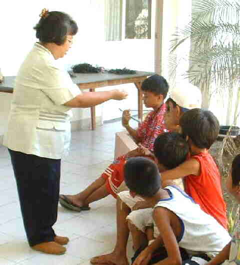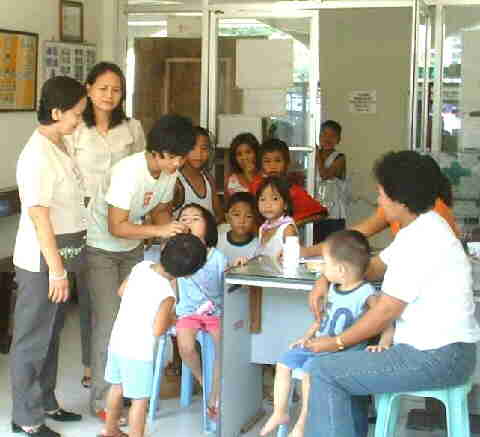 | Dr. de Guzman, the Public Health Dentist, giving away free toothbrushes with instructions on proper use to children beneficiaries. . |