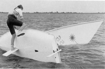 爬上船底,站在船身的邊,抓住中央板,身體向後將船轉至側臥水中.