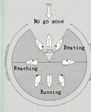 船首迎向風的左右各約45度之內,帆無法張滿,帆面無法產生浮升力,船隻因此不能前進.