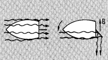 風吹過一個曲面,兩邊的空氣流速不同,產生浮升力,這力可分解為前推力和風壓.