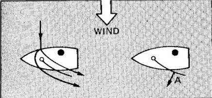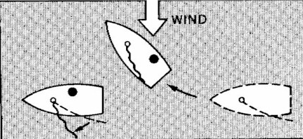 將舵推或拉向一側,風吹船向後走時,舵就有作用,將船轉向.直到船首離開風45度,拉主帆繩讓帆吃風,船就走了.