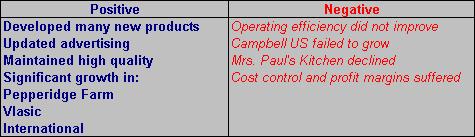 McGovern’s commitment to rapid expansion through new product development had the negative effect of slighting the company’s core business, US soup. Indeed, net earnings in the Campbell US division actually fell from $205 million in 1980 to $175 in 1989. On the positive side, earnings growth in the Pepperidge Farm, Vlasic, and International divisions was substantial. Nevertheless, McGovern’s aggressive marketing and new product development campaigns made it difficult for the company to achieve its low-cost production targets while maintaining high quality, a problem that continues to perplex the company to the present day. Table 1 summarizes some of the positive and negative aspects of Gordon’s McGovern’s tenure as head of Campbell Soup Company.