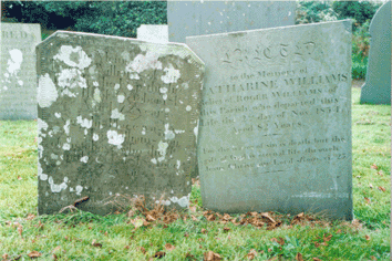 | The tombstones at Abbotsham Churchyard (Devon) of Roger WILLIAMS (1746-1818) and his wife Catherine (nee BRANTON) (1752-1834) Photo courtesy of Sally Carter |