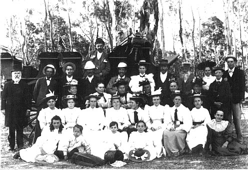 | There are only 3 people positively identified in this photo. The estimate of the date of the photo is taken from the lad standing far right - Benjamin Allen CARVOSSO. He was born in 1880 and looks about 17 ?? making the picnic around 1897. The other two people who are identified are Robert CHEEK (4th from right back row) and Baker Banks CARVOSSO (3rd from right back row). It is possible that Alice Mary CARVOSSO is the lass far left of the 'girls' row! The location is Belair - notice the charabanc in the background. The people most likely to be in this photo are descendants of John WILLIAMS and his wife Mary Ann (nee CORK). If you think you may be able to identify anyone - please contact me. |