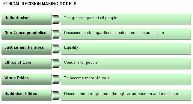 ETHICAL LEADERSHIP Ethics "involve the investigation and application of morals and values" (Dalglish, Dubrin, & Miller, 2006, p. 144) through consideration of others as opposed to self-interests. Ethics vary between individuals and groups due to influences of morals and cultural values. According to Dalglish, Dubrin, and Miller (2006, p. 127) values are beliefs that model our behaviour and are influenced by early caregivers, education, religion, peers, media, experience, books, and social cultural and professional environments. Dalglish et al. (2006, p. 128) describes morals as indicators of right and wrong that are taken seriously and cannot be influenced by authority. Ethical behaviour is encouraged in organisations through a system of values and shared purpose and is promoted in the professional environment by self-confidence and commitment (Dalglish, Dubrin, and Miller, 2006, p. 142). Dalglish, Dubrin, and Miller (2006, pp. 135-140) describe ethical issues facing organisations today as professional reputation, social and environmental responsibility, globalisation and global responsibility. * Reputation is based on people�s perception of you as a moral person and leader. Organisations with good reputations encourage other organisations to follow. * Social and environmental responsibilities persuade organisations to be more considerate of society and the environment. Four types of social responsibility are legal, ethical, economic and philanthropic. * Globalisation and global responsibility involve decision making that take into account consideration of differing cultural values. The following diagram summarises the different ethical decision making models as described in Dalglish, Dubrin, and Miller (2006, pp. 129-134). |