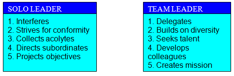 | Team leaders share power, de-emphasise individual glory, and understand that power sharing increases their own power. The solo style of leader is the traditional autocratic leader in a bureaucracy.