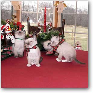 | We presently have no kitties, but please feel free to contact us if you would like to get on our list for our next litter, planned for early fall. Our last litter, Josie and Dusty's frolicsome foursome, have all found absolutely perfectly wonderful homes. It made saying "good-bye" so much easier! We couldn't be happier. |